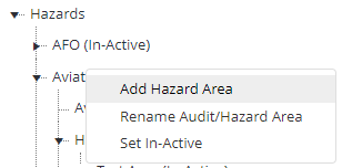 - To add a new area, right-click on any of the existing areas in the hierarchy tree (or the main "Hazard" heading).