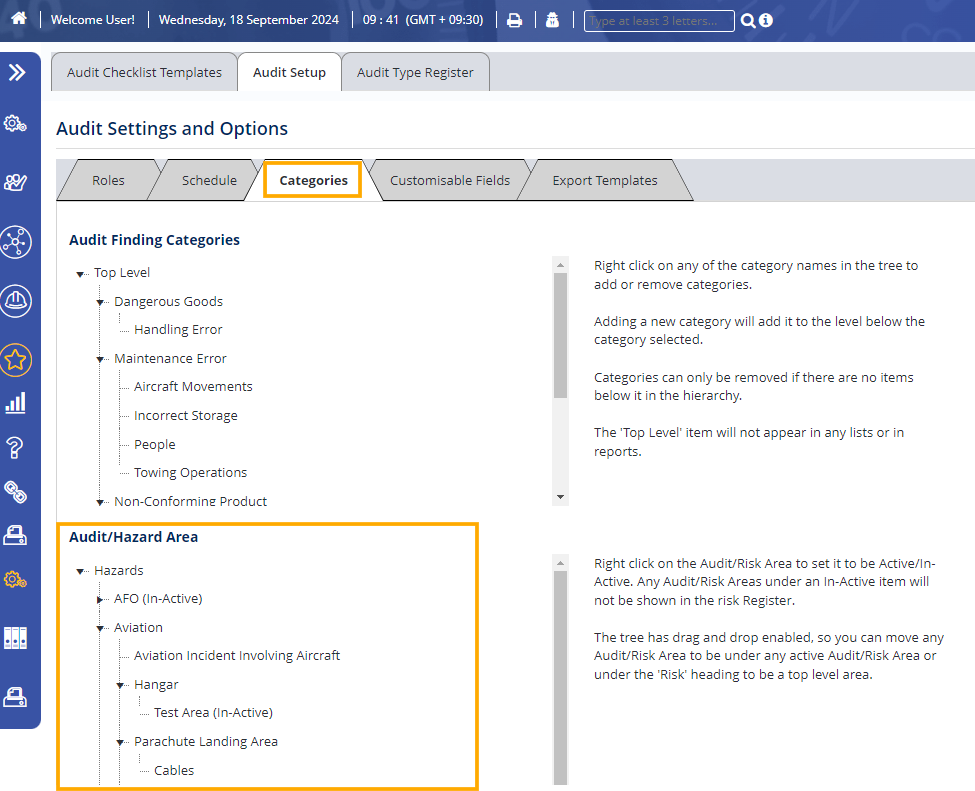 The Audit/Hazard areas are used to group and classify the hazards and share the same setup page, which can be used to add and manage the Areas.