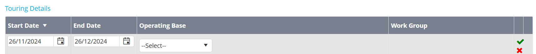 - Fill in the date range and Base details of the person who will be touring.