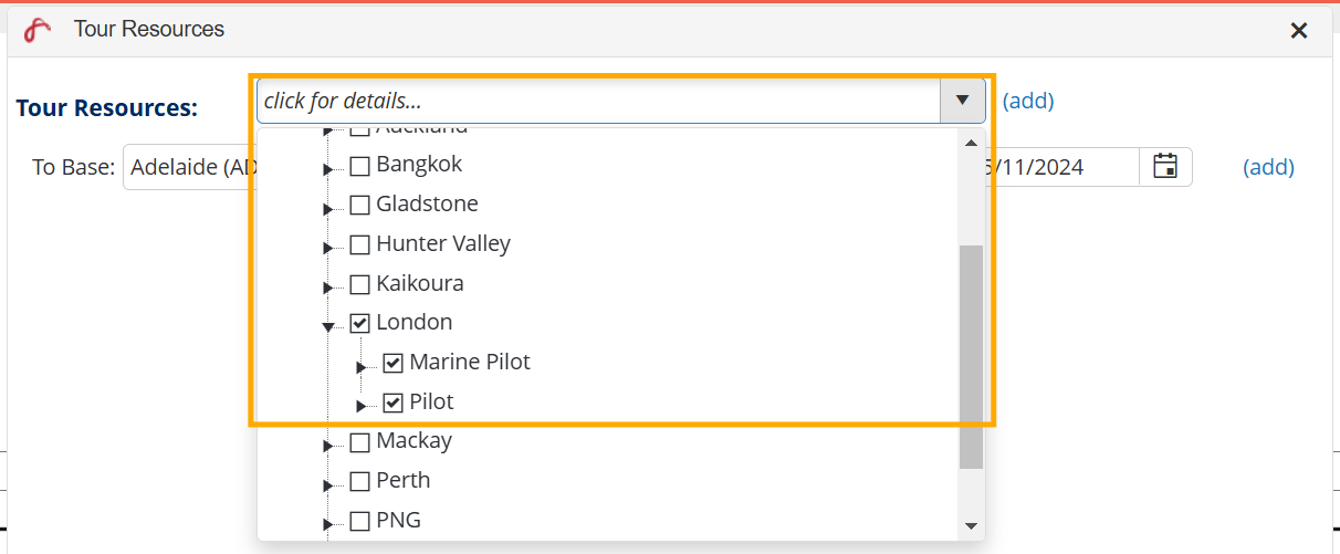 - In the Tour Resources pop-up window, click on the top field to choose the Base and Departments you wish to tour.