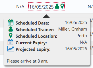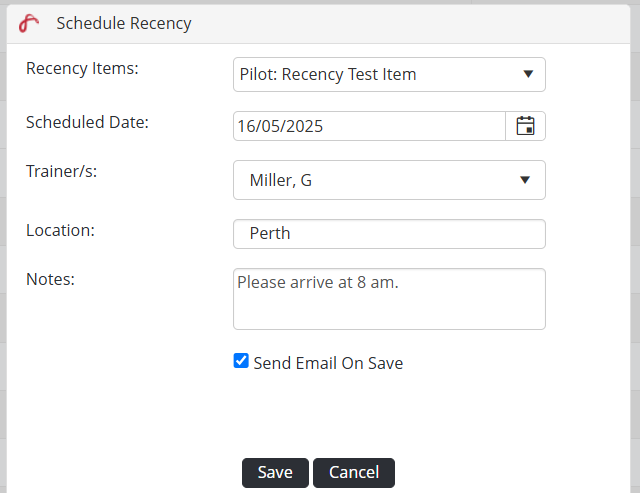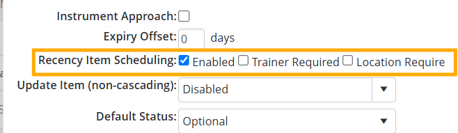 Make sure the “Recency Item Scheduling” option is ticked and review which scheduling details (trainer, date, location) are required for this item.