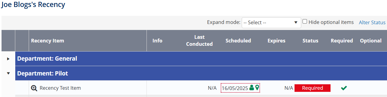 - To schedule a recency for a user, click on the tri-icon under the "Scheduled" column in line with the relevant recency or the aircraft type of that recency.