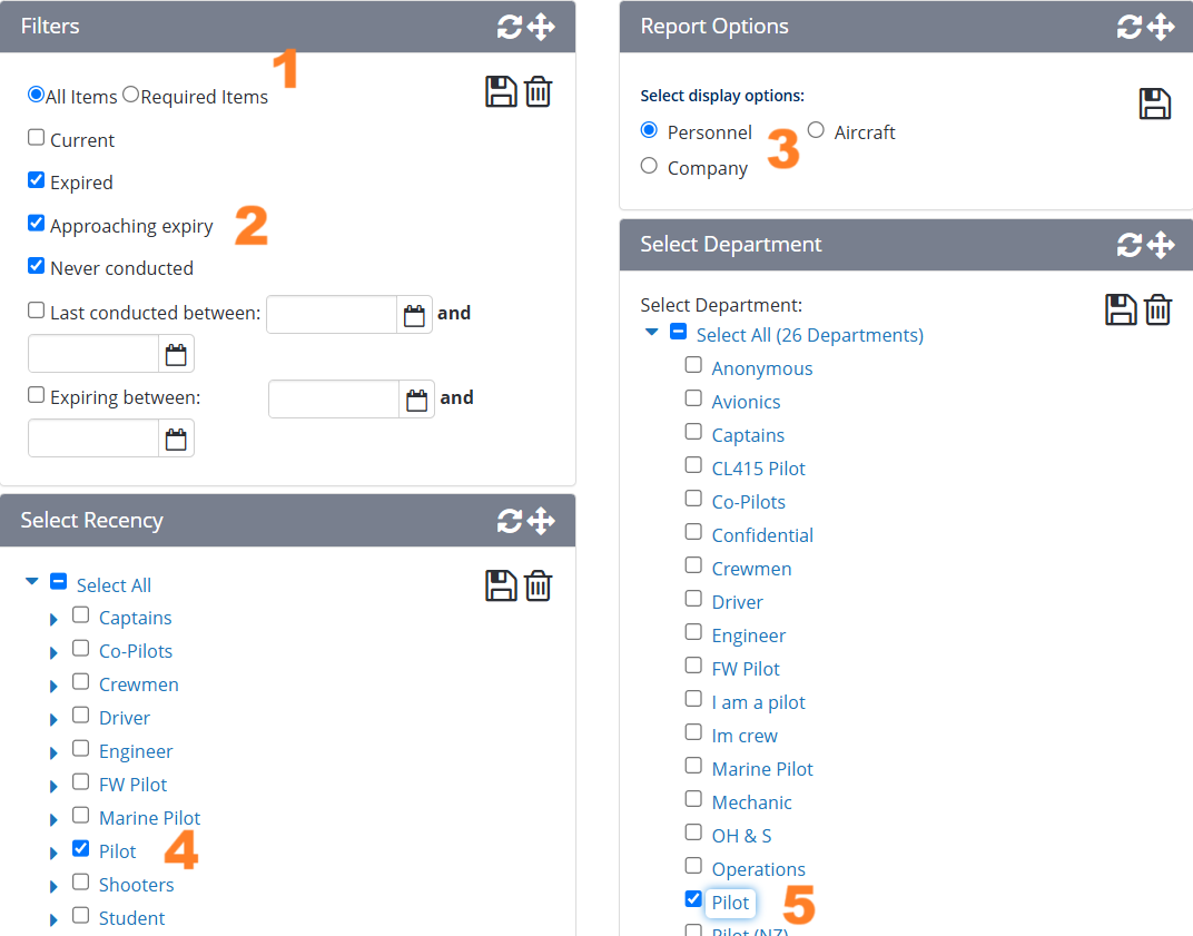 - Use different Filter widgets on the Dashboard to narrow down the selection of personnel or recency items that will be generated.