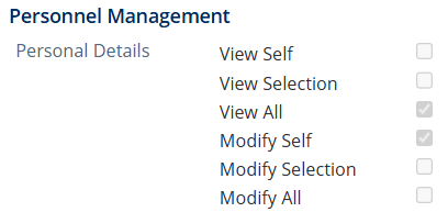 - Personal Details > View Selection or View All or Modify Selection or Modify All