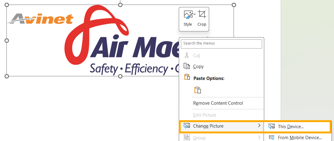 Right-click on the existing logo and select Change Picture.