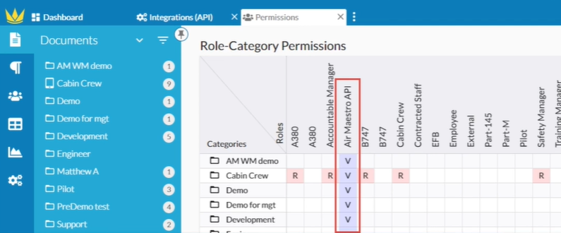 In Role-Category Permissions, use the Air Maestro API column to grant View permission per category/folder you want synchronised to Air Maestro.