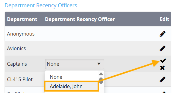Using a pencil icon to the right, assign a Base Recency Officer for the entire base, or specify officers per department for that base.