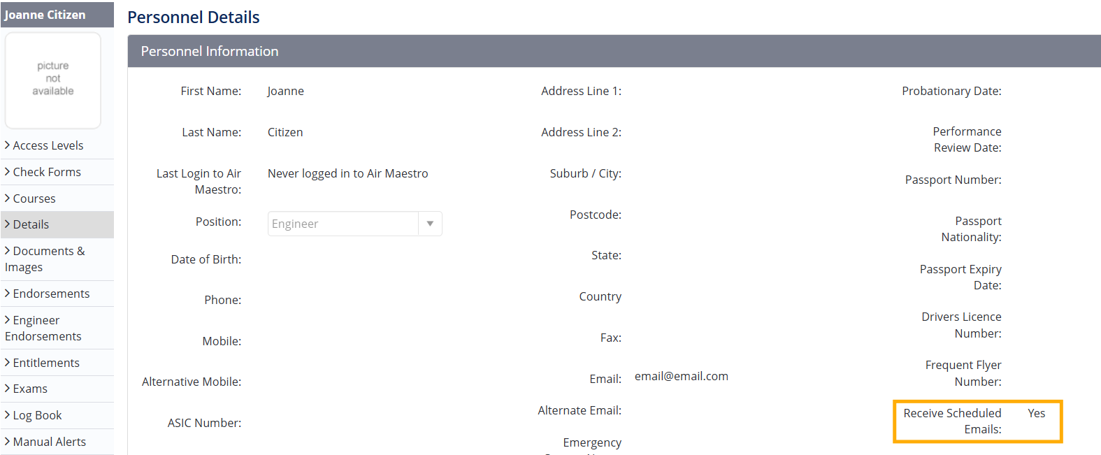 When set up, Contacts will receive an Air Maestro Alert for expiring recency items. No specific emails are sent.