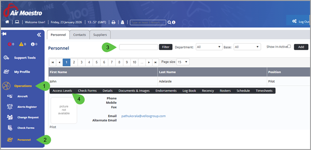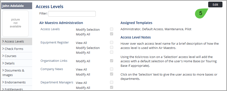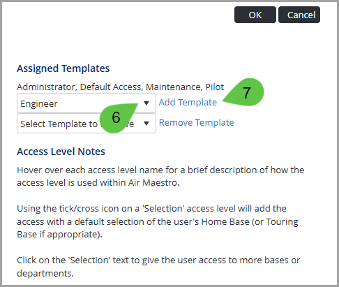 9. Click OK to save the changes to the Access Levels screen for the user.