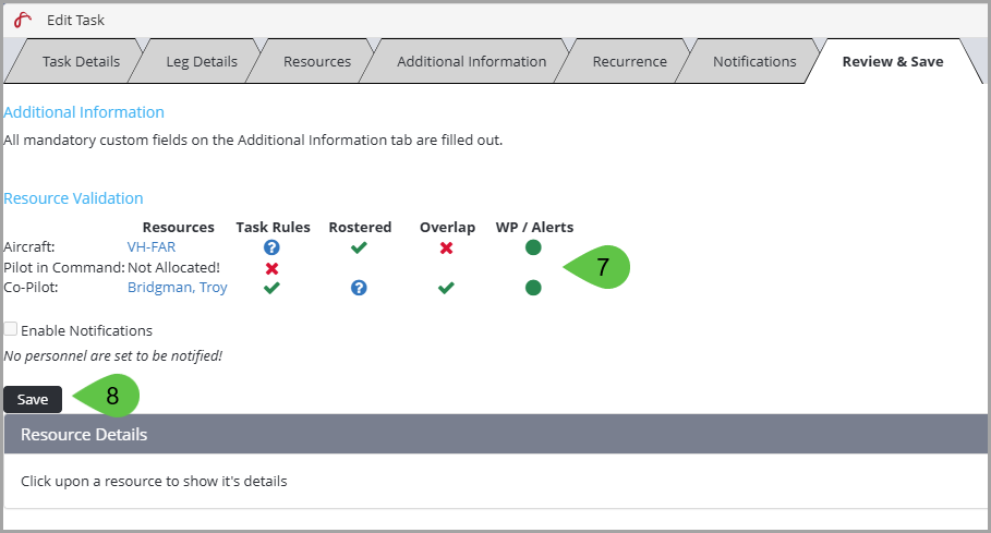 Note: Hovering over the icons in the Resource validation field, provides you with the any conflicts with resource availability.