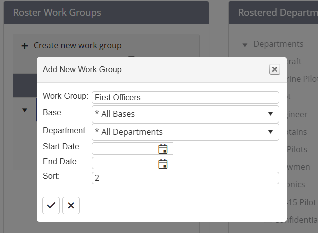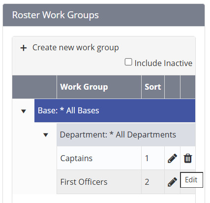 Newly created Work Groups will show on the list, sorted by Base, then Department.