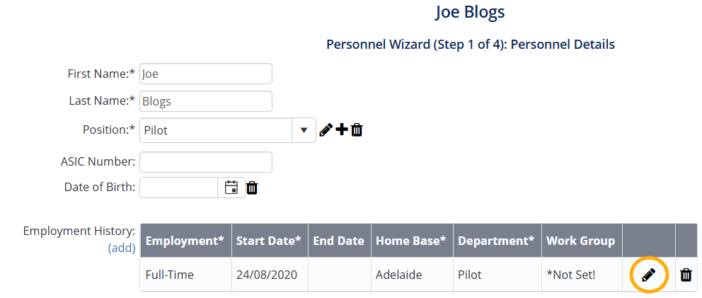 Click the tick underneath to update the employment record.