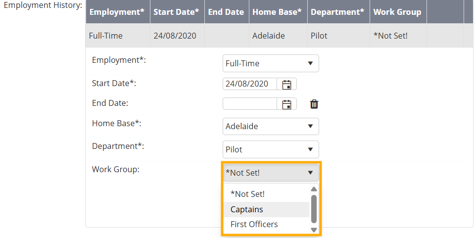 Work Groups may not appear in the dropdown if their active dates do not overlap with an employee’s Employment Record.