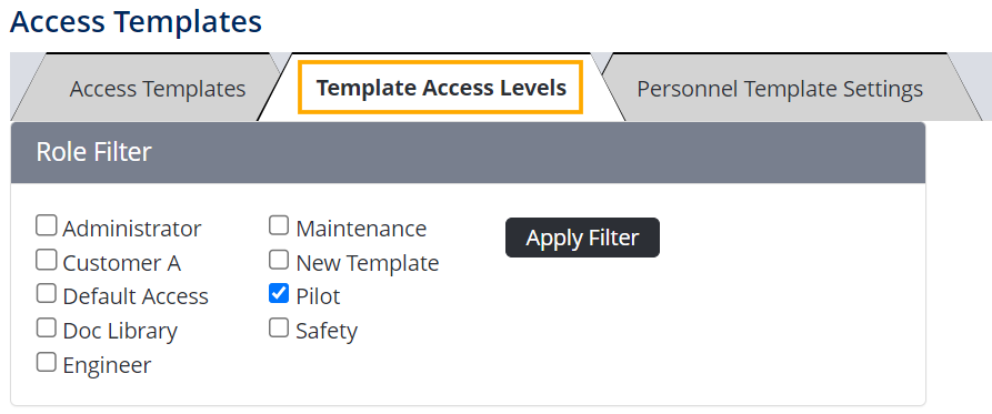 Click Apply Filter. The access level settings for the selected template will display underneath.