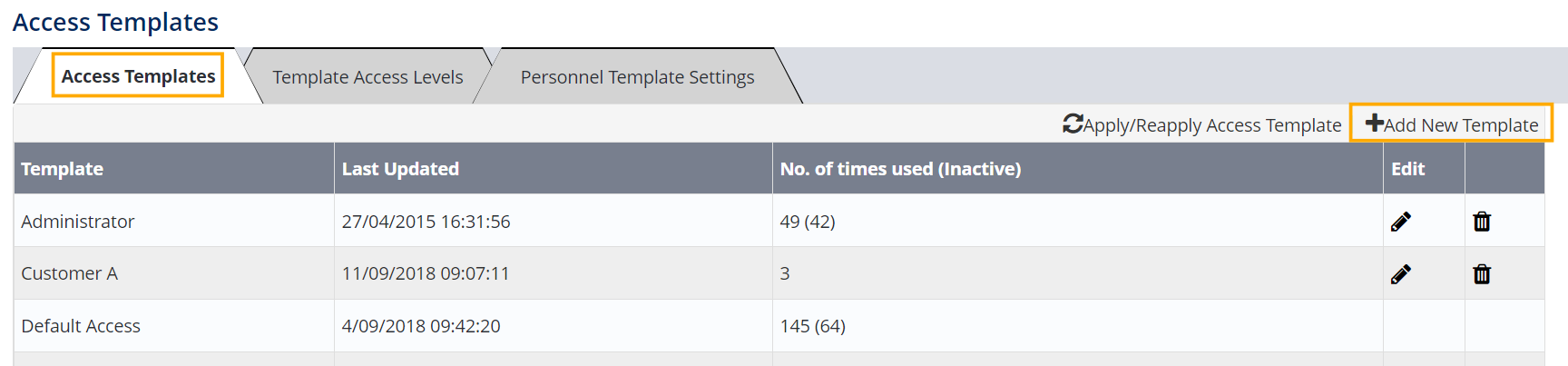 If you are editing the template, please keep in mind the changes will not automatically apply to template assignees. You need to go to the Access Templates tab and click on the Apply/Reapply Access Template button at the top of the table. You would then choose a relevant template from the dropdown list at the top, tick the personnel that needs to have the template re-applied, and click on the button saying Re/Apply Access Template.