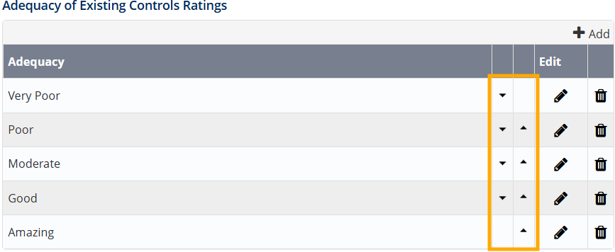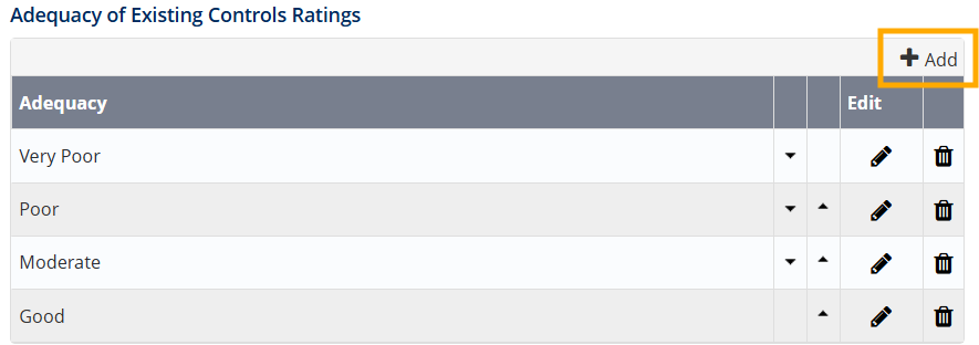 - Scroll down to the Adequacy of Existing Controls Ratings section and click +Add.
