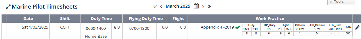 - Duty Time - shows whether the shift was in Home or Away Base, lists all entered duty times and the total of duty hours