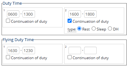 If the duty was a split shift (there was a significant amount of rest between work), enter the times in the subsequent Duty and FDP boxes and tick the "Continuation of duty" checkbox underneath, specifying the type of rest (DH stands for Dead Heading).