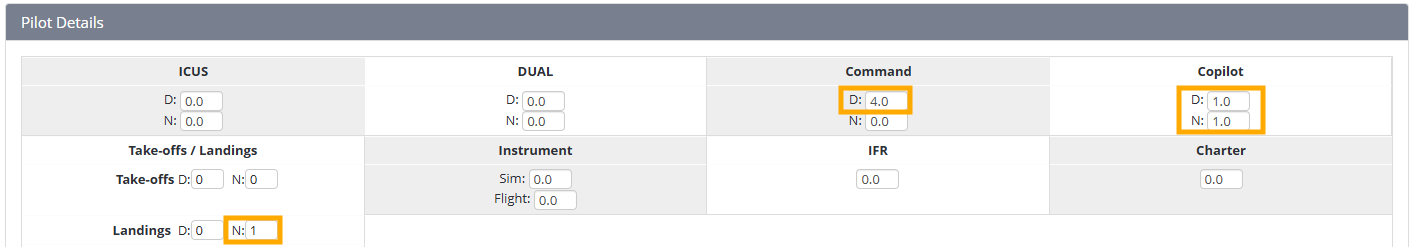 For example, if during a 6-hour flight, you've done 4 command hours during the day, 2 co-pilot hours -1 during the day and 1 during the night - and performed 1-night landing, you would enter the below: