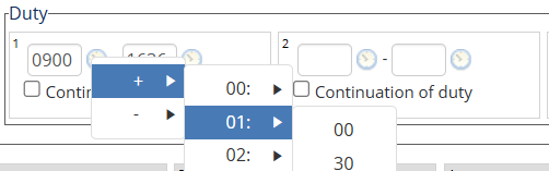4. Enter the duty start and end time in the Duty field in the 24-hour format.